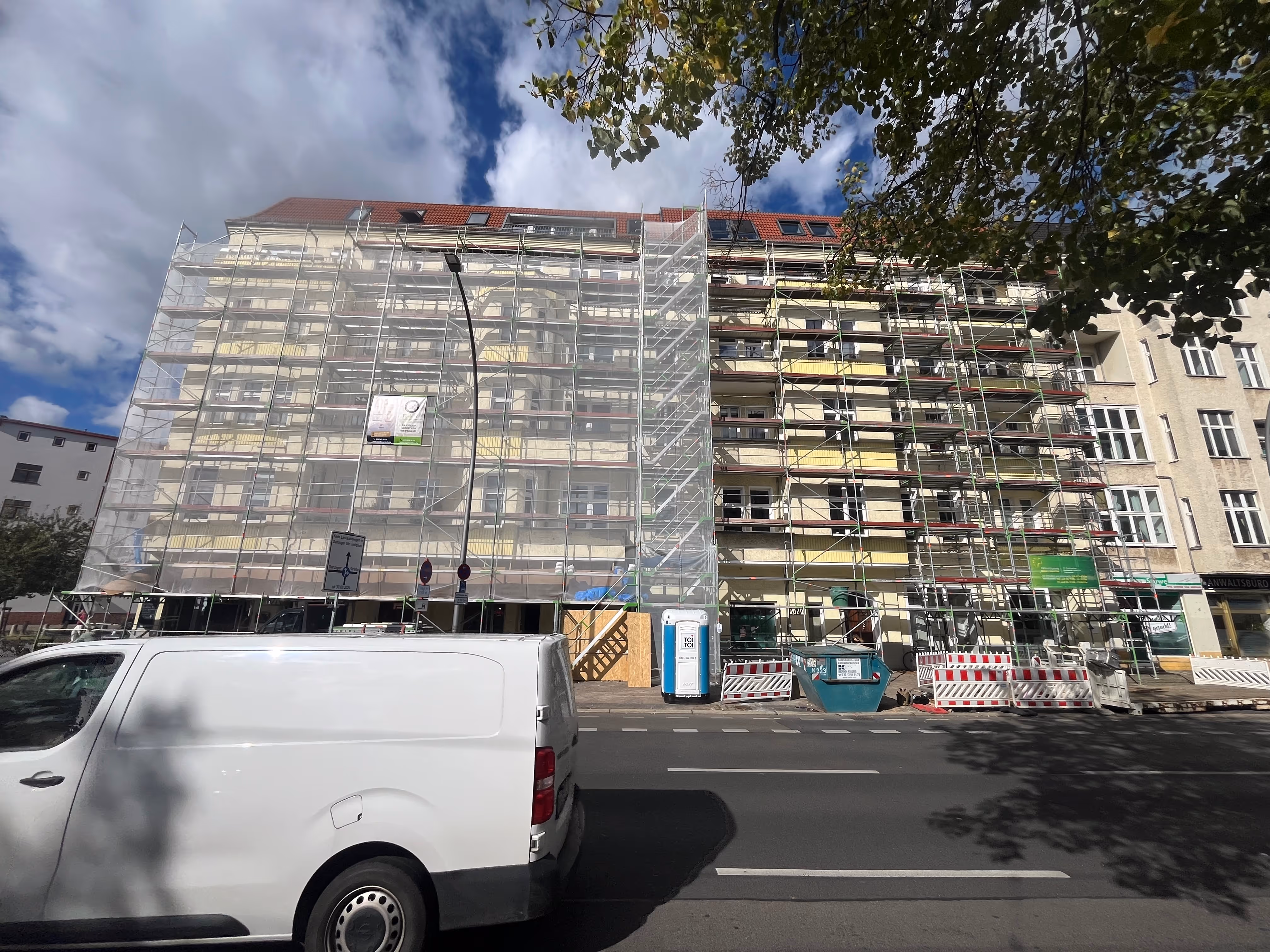 Der Aufbau unserer Fassadengerüste der Firma Layher, welche zu den etabliertesten Systemlösungen im Fassadengerüstbau gehören, werden nach den aktuell geltenden DIN-Normen, Vorgaben der TRBS sowie den aktuellen Bestimmungen der BG Bau aufgebaut. Bevor wir ein Gerüst aufbauen, wird ein Vor-Ort-Termin vereinbart um zum einen Maß zu nehmen und alle erforderlichen Gegebenheiten zu prüfen. Hier ist die Beschaffenheit der Standflächen existenziell. Beim abgebildeten Projekt war es wichtig die Durchfahrt in den Hinterhof zu gewährleisten, dort befinden sich die Parkplätze für das Objekt. Wir haben eine Lösung gefunden und diese entsprechend umgesetzt.