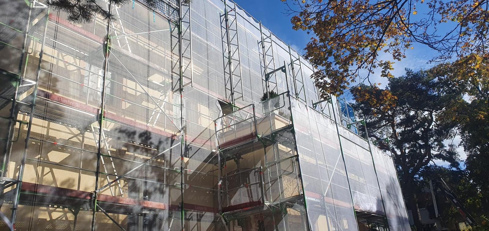 Fassadengerüste sorgen für sichere Arbeitsbedingungen an der Gebäudehülle. Stabil, flexibel und individuell geplant für jedes Bauvorhaben.